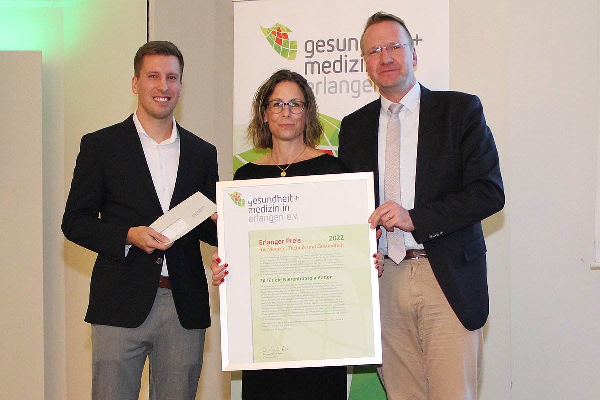 Das Forschungsprojekt „Fit für die Nierentransplantation durch Rehabilitation“ hat den diesjährigen mit 500 Euro dotierten Erlanger Preis für Medizin, Technik und Gesundheit in der Kategorie „Medizinische Versorgung“ erhalten. Das 2020 gestartete Projekt wird von Prof. Dr. Mario Schiffer, Direktor der Medizinischen Klinik 4 – Nephrologie und Hypertensiologie des Uniklinikums Erlangen, geleitet und vom Bayerischen Staatsministerium für Gesundheit und Pflege bis Ende Mai 2023 mit rund 450.000 Euro gefördert. Projektmanager ist Helge Krusemark, Fallmanagerin ist Judith Kleemann – beide ebenfalls von der Medizin 4 des Uniklinikums Erlangen.