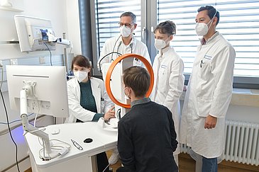 Je nach Symptomatik werden in der Post-COVID-Ambulanz des Uniklinikums Erlangen verschiedene Untersuchungen veranlasst. Zur Diagnostik gehören u. a. die Optische Kohärenztomografie-Angiografie (OCT-A) zur Untersuchung der kleinen Blutgefäße der Augen, Blutanalysen, ein psychosomatisches Gespräch und die psychometrische Testung der kognitiven Leistungsfähigkeit. Zum Abschluss erhalten die Patientinnen und Patienten eine erste diagnostische Einordnung und konkrete Therapieempfehlungen.