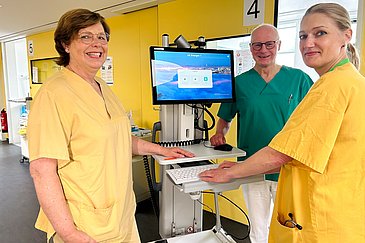 Der am Klinikum Forchheim – Fränkische Schweiz eingesetzte Visitenwagen wurde vom Universitätsklinikum Würzburg speziell für den Aufbau einer bayernweiten Teleintensivmedizin-Infrastruktur entwickelt. Das mobile Terminal mit Kameras, Mikrofon und mehreren Monitoren erlaubt dem behandelnden Ärzteteam – etwa des Klinikums Forchheims – bei komplexen Fällen in Echtzeit Rücksprache mit Intensivmedizinerinnen und -medizinern anderer Kliniken – etwa des Uniklinikums Erlangen – zu halten. Das System übermittelt nicht nur Bild und Ton, sondern bei Bedarf auch Patientendaten, Informationen zum bisherigen Krankheitsverlauf sowie wichtige Vitalparameter. So können beide Ärzteteams trotz räumlicher Distanz gemeinsam fundierte Therapieentscheidungen treffen – das Team vor Ort mit dem mobilen Visitenwagen am Patientenbett, das Team der zugeschalteten Klinik vom stationären Arbeitsplatz aus. Dabei stets gewährleistet: die Sicherheit der sensiblen Patientendaten. „Mit dieser neuen Telemedizin-Station für Intensivstationen können wir unseren Patienten in extremen Notfallsituationen jetzt noch besser helfen“, sagte Chefarzt Dr. Ulrich von Hintzenstern, Leiter der Abteilung für Anästhesie und Intensivmedizin im Klinikum Forchheim - Fränkische Schweiz.