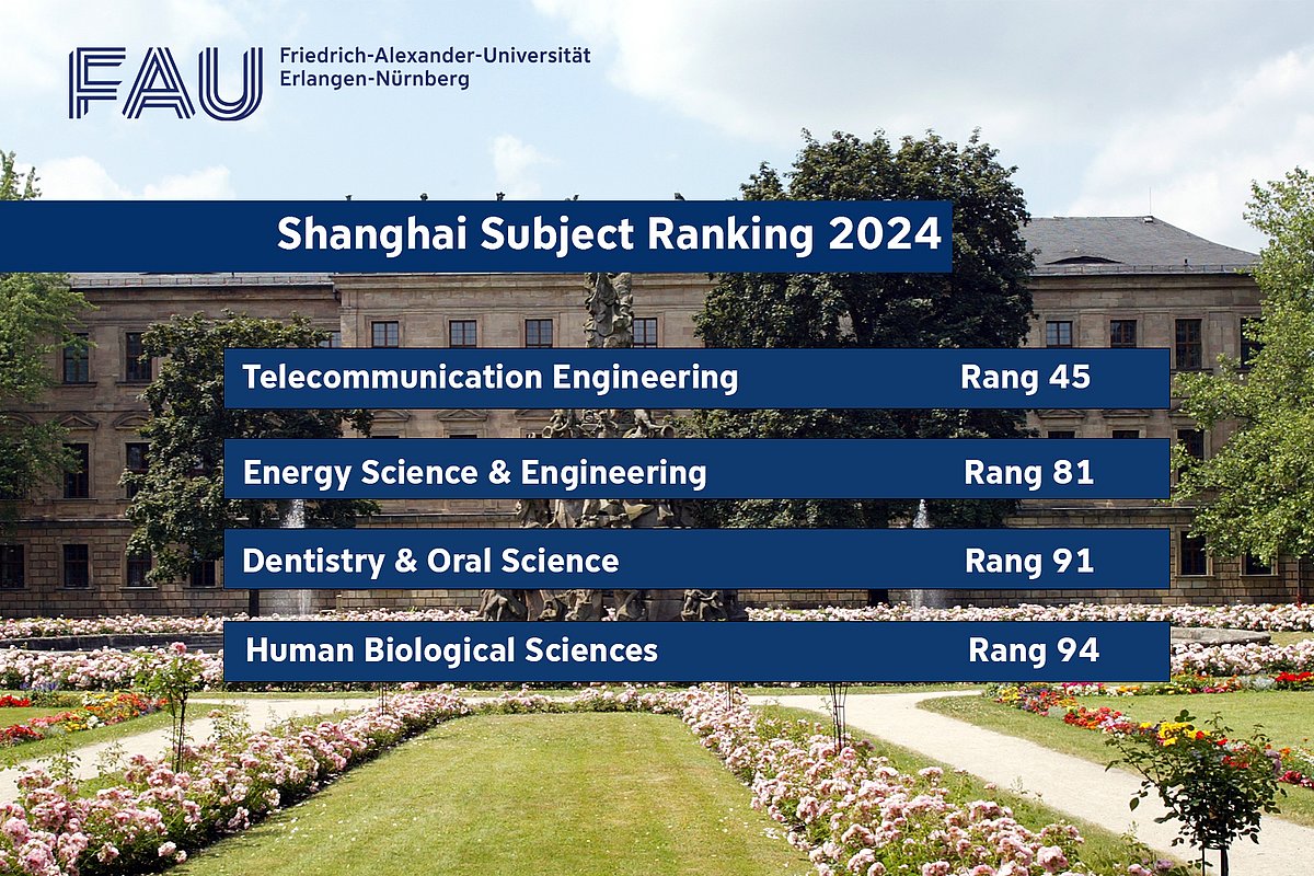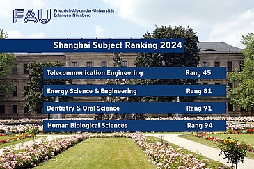 Die jüngste Veröffentlichung des ARWU (Academic Ranking of World Universities) Ranking hat auch 2024 eine Einordnung der FAU hinsichtlich der wissenschaftlichen Leistung vorgenommen. Das ARWU ist das älteste und eines der drei renommiertesten Universitätsrankings und bewertet nicht nur akademische Institutionen, sondern auch deren Einzeldisziplinen. Das ARWU berücksichtigt dabei wissenschaftliche Kennzahlen wie Publikationen, Impact, Zitierungen, internationale Kooperationen, Patente, Preise, etc. Auf dieser Basis erfolgt dann ein weltweiter Vergleich zwischen der wissenschaftlichen Leistung einzelner Disziplinen.