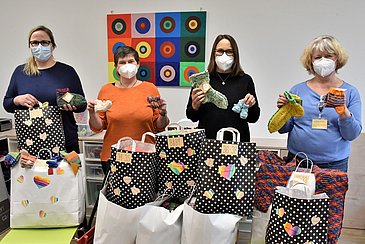 „Sucht eure bunteste Wolle raus und lasst die Nadeln glühen“ – mit diesen Worten startete Grit Kreusch aus Lohr am Main im November 2022 auf ihrem Instagram-Account die Aktion „buntumsherz“. Das Ziel dieses Herzensprojekts: den jungen Patientinnen und Patienten der Kinder- und Jugendklinik (Direktor: Prof. Dr. Joachim Wölfle) des Uniklinikums Erlangen mit farbenfrohen Stricksocken eine kleine Freude und vor allem warme Füße bereiten. Insgesamt 110 Frauen aus ganz Deutschland und sogar aus Luxemburg beteiligten sich an der Aktion, sodass schließlich 579 Paar handgefertigte Socken in verschiedenen Größen, 27 Paar Babyschuhe, acht Mützen und Stirnbänder, ein Schal sowie fünf Paar Handstulpen zusammenkamen. Die leitende Erzieherin der Kinderklinik Marion Müller nahm die einzigartigen Strickarbeiten in liebevoll gestalteten Geschenktüten gemeinsam mit ihrer Kollegin Pamela Krebs dankend entgegen.