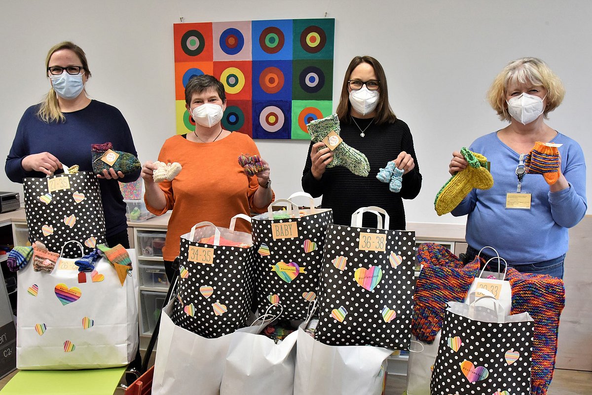 „Sucht eure bunteste Wolle raus und lasst die Nadeln glühen“ – mit diesen Worten startete Grit Kreusch aus Lohr am Main im November 2022 auf ihrem Instagram-Account die Aktion „buntumsherz“. Das Ziel dieses Herzensprojekts: den jungen Patientinnen und Patienten der Kinder- und Jugendklinik (Direktor: Prof. Dr. Joachim Wölfle) des Uniklinikums Erlangen mit farbenfrohen Stricksocken eine kleine Freude und vor allem warme Füße bereiten. Insgesamt 110 Frauen aus ganz Deutschland und sogar aus Luxemburg beteiligten sich an der Aktion, sodass schließlich 579 Paar handgefertigte Socken in verschiedenen Größen, 27 Paar Babyschuhe, acht Mützen und Stirnbänder, ein Schal sowie fünf Paar Handstulpen zusammenkamen. Die leitende Erzieherin der Kinderklinik Marion Müller nahm die einzigartigen Strickarbeiten in liebevoll gestalteten Geschenktüten gemeinsam mit ihrer Kollegin Pamela Krebs dankend entgegen.