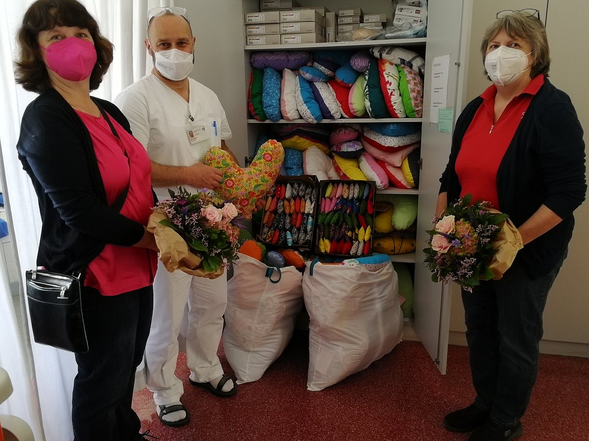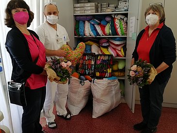 „Wir freuen uns sehr über die schönen bunten Kissen und bedanken uns ganz herzlich für die Mühe. In unserem Universitäts-Brustzentrum Franken finden sehr viele Brustoperationen statt, die Kissen sind hier also in jedem Fall an der richtigen Stelle“, sagte PD Dr. Carolin Hack, leitende Oberärztin der Frauenklinik, bei der Übergabe. Zusammen mit Physiotherapeut Mario Witter nahm sie die insgesamt 300 Kissen entgegen und überreichte den ehrenamtlichen Näherinnen im Namen von Klinikdirektor Prof. Dr. Matthias W. Beckmann jeweils einen Blumenstrauß als Dankeschön.