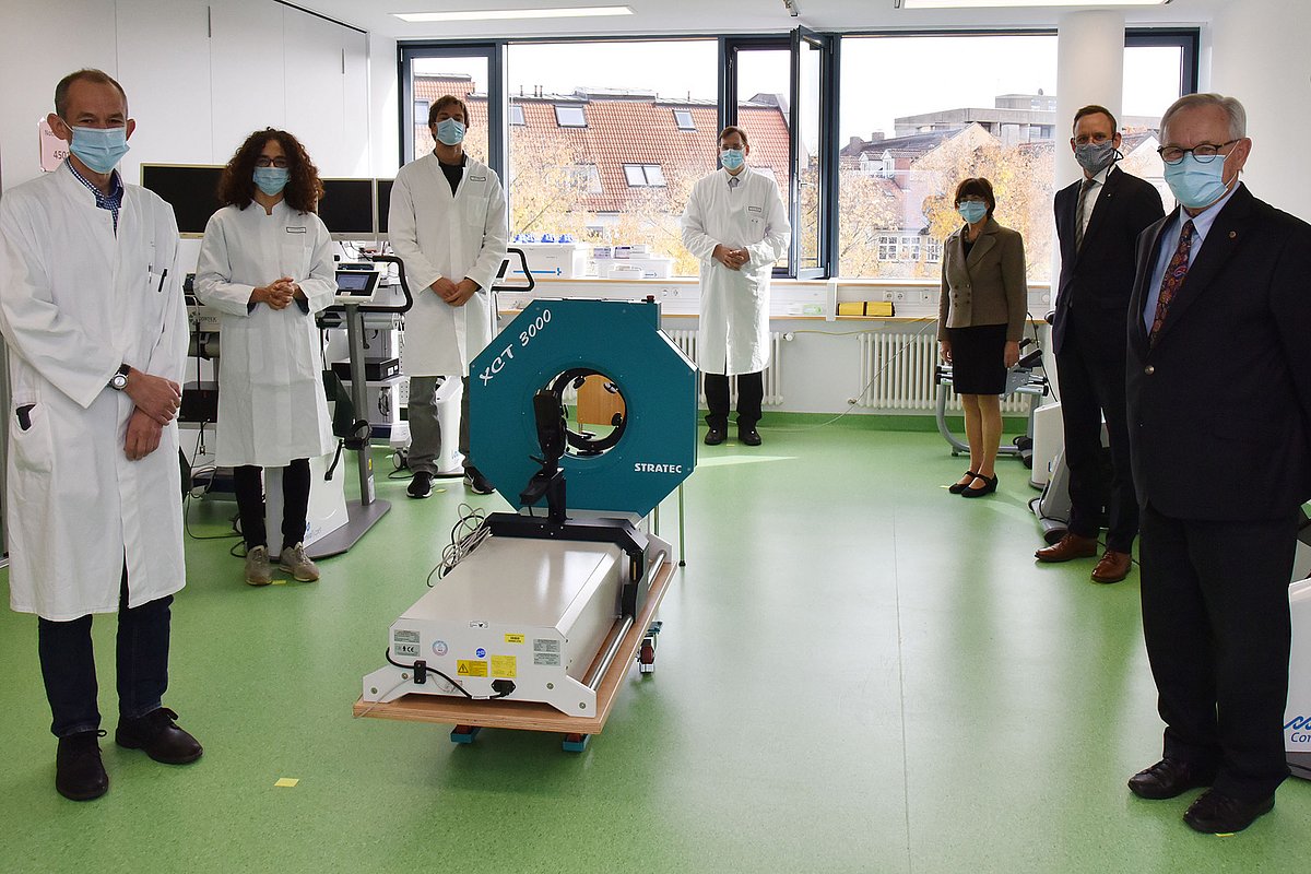 Eine gemeinsame Spende ermöglichte dem Hector-Center für Ernährung Bewegung und Sport des Universitätsklinikums Erlangen die Anschaffung eines pQCT-Geräts (periphere quantitative Computertomografie) zur Messung der Muskelbeschaffenheit. Mithilfe des pQCT-Messverfahrens können die behandelnden Ärzte und Wissenschaftler nicht nur den Muskelstatus, sondern auch die Knochendichte von Krebspatienten und Menschen mit chronischen Erkrankungen präzise quantifizieren und so individuelle Therapien entwickeln. Der Verein zur Förderung des Tumorzentrums Erlangen-Nürnberg, vertreten durch den Vorstandsvorsitzenden Thomas Pickel und Fördermitglied Christa Matschl, trug 10.000 Euro zu dem Erwerb bei. Die Manfred-Roth-Stiftung, vertreten durch den Vorstandsvorsitzenden Dr. Wilhelm Polster, unterstützte die Anschaffung mit einer Spende in Höhe von 40.000 Euro, die über die Forschungsstiftung Medizin am Uni-Klinikum Erlangen, vertreten durch den Vorstandsvorsitzenden Prof. Dr. Werner G. Daniel, im Rahmen ihres Matching-Funds-Programms um 14.000 Euro zusätzlich aufgestockt wurde. Für die jetzige Anschaffung des Geräts wurden zudem auch frühere Spenden der beiden beteiligten Förderer verwendet.