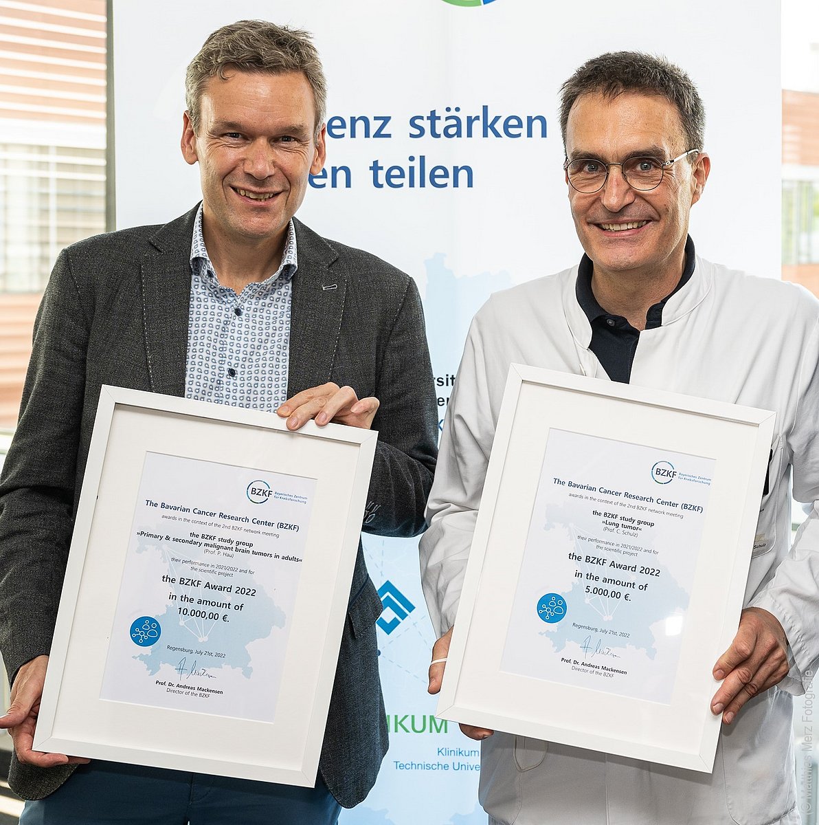 Im Rahmen einer Posterpräsentation stellten die Sprecher der BZKF Leuchttürme und Studiengruppen ihre Ergebnisse der ersten Förderperiode 2020/2021 vor. Prof. Dr. Tobias Pukrop, Direktor des Comprehensive Cancer Center Ostbayern des Universitätsklinikums Regensburg, erklärte: „Die geförderten BZKF Studiengruppen sind ein wichtiger Bestandteil des BZKF und sollen langfristig neue Therapiekonzepte gegen Krebserkrankungen evaluieren. Um eine hohe wissenschaftliche Qualität in den Studiengruppen sicherzustellen, werden diese zunächst nur befristet gefördert und von externen sowie von internen und internationalen Gutachterinnen und Gutachtern evaluiert. Für Ihre herausragende Arbeit während der vergangenen 18 Monate wurden die BZKF Studiengruppe Primäre und Sekundäre maligne Hirntumoren bei Erwachsenen und die BZKF Studiengruppe Lungentumoren mit dem 1. BZKF Award und einem Preisgeld von 10.000,00 € bzw. 5.000,00 € ausgezeichnet. Wir sind sehr stolz, dass wir bereits nach zwei Jahren als BZKF-Verbund die Weichen für die Entwicklung innovativer Krebstherapien gestellt haben.“