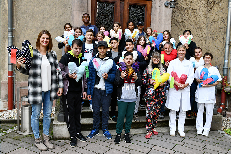 Die Nürnberger Georg-Holzbauer-Mittelschule nennt sich selbst „Schule mit Herz, Hand und Verstand“ – wie passend schien es da, mit den eigenen Händen Herzkissen für die Brustkrebspatientinnen des Universitätsklinikums Erlangen zu nähen! Etwa 100 Stück fertigten die Schülerinnen und Schüler der Jahrgangsstufe acht in den vergangenen Wochen an. Am heutigen Freitag (27.09.2019) übergaben 20 von ihnen die selbst genähten Geschenke an Oberärztin PD Dr. Carolin Hack und die stellvertretende Stationsleitung der Station B der Frauenklinik (Direktor: Prof. Dr. Matthias W. Beckmann), Kathrin Albers.
