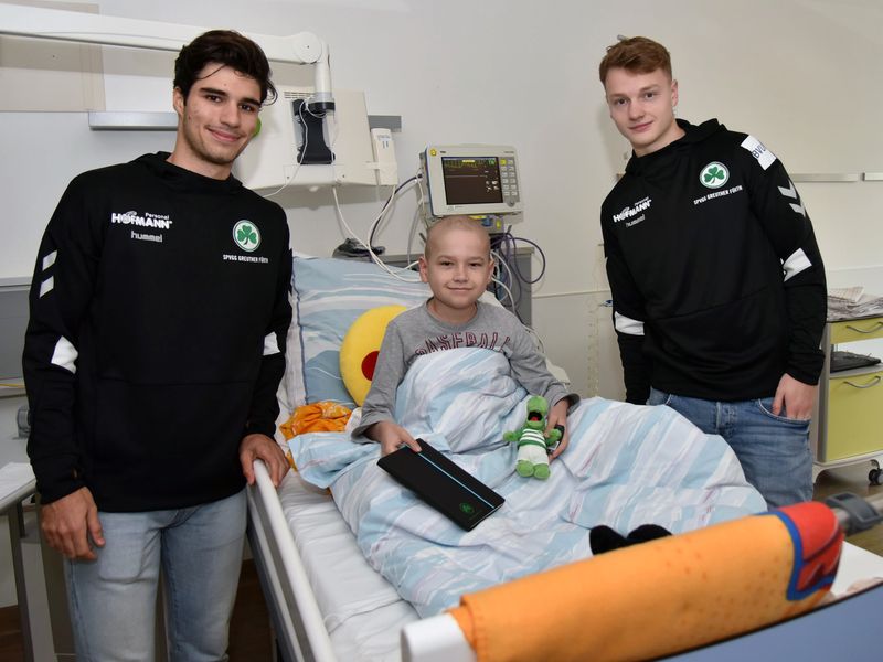 Mit einem Korb voller Miniatur-Eddys besuchten die beiden Fußballprofis Elias Abouchabaka und Robin Kehr Mitte Dezember die kinderonkologische Station 2C der Kinder- und Jugendklinik (Direktor: Prof. Dr. Joachim Wölfle) des Universitätsklinikums Erlangen. Der Mittelfeldspieler und der Mann aus dem Angriff der Spielvereinigung Greuther Fürth sorgten für strahlende Kinderaugen bei vielen kleinen Patientinnen und Patienten, die die Vorweihnachtszeit im Krankenhaus verbringen müssen.