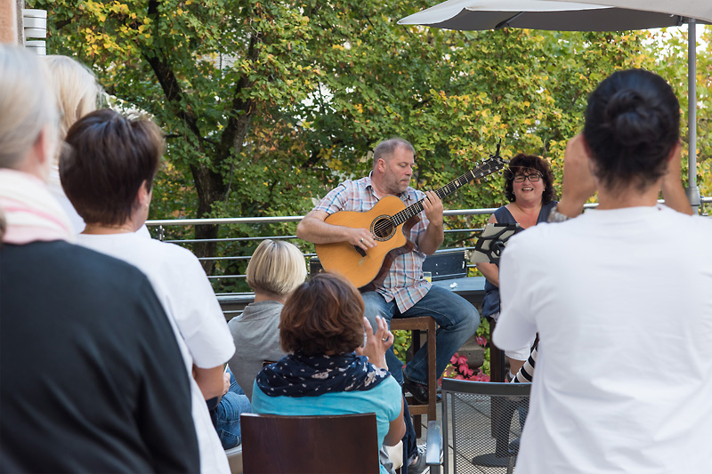 Kranken Menschen muss man beistehen: Die beiden Erlanger Musiker Wulli und Sonja (Musikkneipe Strohhalm) haben sich gestern (27.09.2017) spontan entschlossen, ein Benefizkonzert auf der Dachterrasse der Palliativstation des Universitätsklinikums Erlangen zu geben. Damit wollten sie "besonderen Menschen in einer besonderen Situation" eine Freude machen.