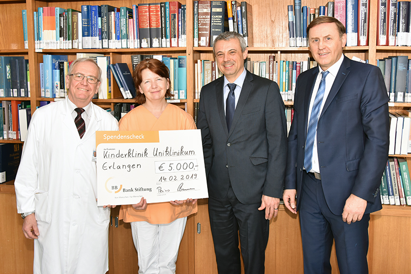 Reinhard Basener und Stephan Blendel von der BBBank überreichten am Donnerstag, 13. Februar 2019 einen symbolischen Scheck in Höhe von 5.000 Euro an Prof. Dr. Dr. h. c. Wolfgang Rascher (Direktor der Kinder- und Jugendklinik des Universitätsklinkums Erlangen) und die leitende Erzieherin Marion Müller. "Aus eigener leidvoller Erfahrung weiß ich, wie zäh und langweilig wochenlanges Liegen im Krankenhausbett sein kann", sagte Reinhard Basener, Filialdirektor Erlangen der BBBank, im Rahmen der Spendenübergabe am Donnerstag, 14. Februar 2018, "da sollen die Tablets für eine willkommene Abwechslung sorgen."