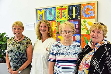Mit Pinseln und Farben, aber auch Federn und Graffiti-Spraydosen gestalteten insgesamt zwölf Frauen unter der Anleitung von Martina Dorsch je einen der bunten Buchstaben. Anschließend wurden die einzelnen Elemente zu einem großformatigen Bild zusammengefügt. „Als wir alle Buchstaben das erste Mal nebeneinander aufgestellt haben, waren wir unfassbar stolz“, erinnert sich Martina Dorsch. Die Erlanger Frauenselbsthilfe Krebs spendete nicht nur die Materialien für das Kunstprojekt, sondern übernahm auch das Einrahmen des fertigen Kunstwerks, das jetzt im Gang der onkologischen Tagesklinik der Frauenklinik des Uniklinikums hängt und allen Patientinnen, die es während ihrer Behandlung vor Augen haben, Mut für ihren Kampf gegen den Krebs schenken soll. „Ich kann vor euch und allen anderen krebserkrankten Frauen, denen ich hier begegne, nur den Hut ziehen“, sagte Patientenlotsin Gabriele Littschwager im Gespräch mit den drei FSH-Vertreterinnen. „Ihr seid alle so unglaublich tapfer!“