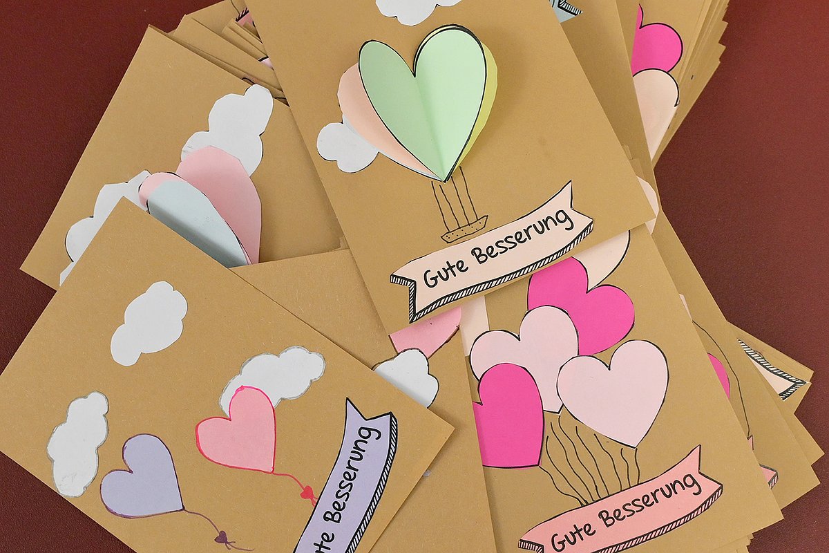 Am Projekttag gab es in allen vier Klassenzimmern des Jahrgangs unterschiedliche Stationen und für jedes Kind eine Aufgabe: Gemeinsam mit engagierten Eltern wurden die Stoffe zugeschnitten, genäht, die Kissen befüllt und anschließend verschlossen. An einer weiteren Station bastelten die Schülerinnen und Schüler liebevoll gestaltete Genesungskarten.