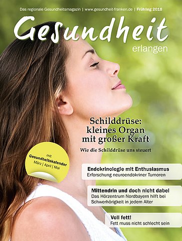 Unter dem Dach von "Gesundheit Franken" erscheinen am heutigen Donnerstag (1. März 2018) sowohl "Gesundheit erlangen" als auch "Gesundheit Bamberg". Titelthema beider Ausgaben ist die Schilddrüse: Wie steuert das kleine "Schmetterlingsorgan" unseren Körper? Was sind typische Symptome einer Unter- und einer Überfunktion und wann sind sie behandlungsbedürftig? Warum müssen Schilddrüsenknoten oft nicht sofort operiert werden und was passiert bei einer Radiojodtherapie? Die Ärzte der Medizinischen Klinik 1 - Gastroenterologie, Pneumologie und Endokrinologie (Direktor: Prof. Dr. Markus F. Neurath) und der Nuklearmedizinischen Klinik (Direktor: Prof. Dr. Torsten Kuwert) des Uni-Klinikums Erlangen wissen Rat. Außerdem fragen die "Gesundheit Franken"-Autoren die Dermatologen des Uni-Klinikums Erlangen: "Wie gefährlich ist eigentlich Kortison?" und erfahren von der Endokrinologin Prof. Dr. Marianne Pavel, wie sie den seltenen neuroendokrinen Tumoren auf die Schliche kommt. Außerdem im Magazin: das neue Hörzentrum Nordbayern, Wissenswertes zu Fetten und Ölen sowie interessante Neuigkeiten für Parkinsonkranke und Fast-Food-Junkies.