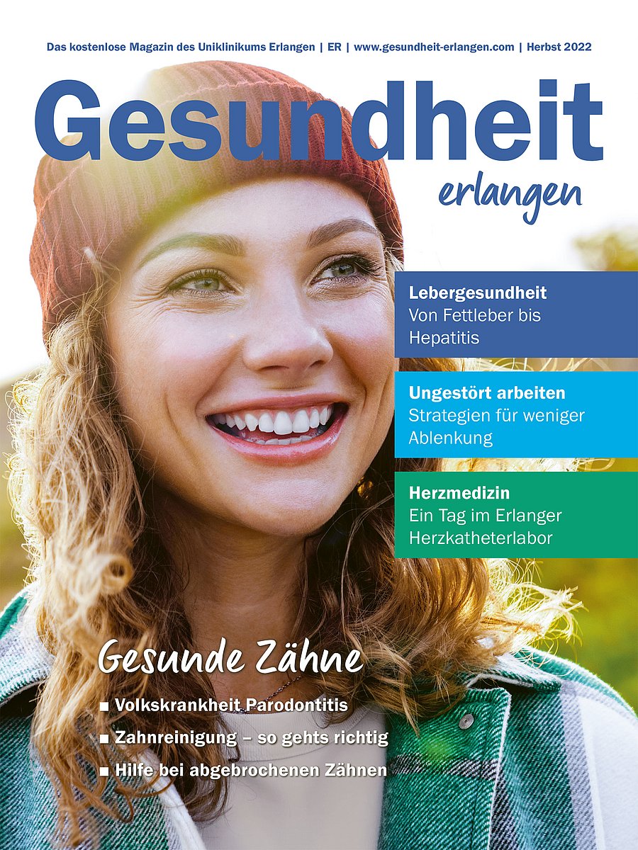 Zähne sollten nicht in erster Linie strahlend weiß sein, sondern gesund. Wie sie das lange bleiben, verrät die aktuelle Ausgabe des Magazins „Gesundheit erlangen“. Sie widmet sich u. a. Fragen wie: Wie entsteht Parodontitis, und wie hängt die Entzündung des Zahnhalteapparats mit anderen Erkrankungen zusammen? Welche Zahncreme ist die beste, wer profitiert von einer professionellen Zahnreinigung und warum ist Zahnseide eher etwas für Jüngere? Und: Was tun, wenn auf dem Sportplatz ein Zahn abbricht? Prof. Dr. Kerstin Galler, seit Oktober 2021 Direktorin der Zahnklinik 1 – Zahnerhaltung und Parodontologie des Universitätsklinikums Erlangen, gibt Antworten. „Gesundheit erlangen“ wird derzeit in Erlangen, Erlangen-Höchstadt, Forchheim und Bamberg verteilt und kann online unter www.gesundheit-erlangen.com gelesen werden.