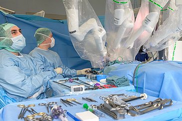 „Denn der Roboter operiert niemals allein“, betont die Ärztin. „Er ist nur ein Hilfsmittel. Die vier Arme und somit die Instrumente werden immer von einer Chirurgin oder einem Chirurgen gesteuert.“ Diese Person sitzt gleich neben dem Da-Vinci-System an einer Konsole und könnte notfalls jederzeit aufstehen und offen weiteroperieren, falls Komplikationen dies erforderlich machen. Dass die Chirurgin bzw. der Chirurg sitzt und eben nicht steht, ist ein weiterer Vorteil: „Das ist ergonomisch günstiger für die Operateurin oder den Operateur und macht sich gerade bei längeren Eingriffen positiv bemerkbar“, sagt Dr. Hirsch-Koch. „Außerdem profitieren wir von einer 3D-Sicht im Inneren des Körpers und können das Operationsfeld bis zu 40-fach vergrößern. Wir sehen die Strukturen wie unter einem Mikroskop. Das ist eine riesige Hilfe und ermöglicht sehr präzises Arbeiten – was gerade bei kindlichen Körpern, in denen alles viel kleiner und feiner ist, von entscheidender Bedeutung ist.“