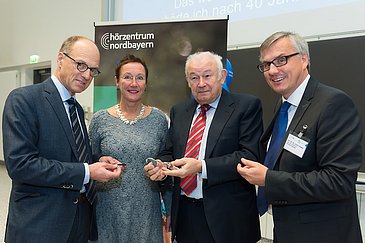 "Die technischen Möglichkeiten zur Verbesserung des Hörens sind heute vielfältig. Die richtige Auswahl erfordert jedoch Erfahrung und kann nur im Team erfolgen", erklärte Prof. Hoppe und Prof. Iro bekräftigte die Interdisziplinarität der neuen Einrichtung: "Hier arbeiten Ärzte, Techniker und Hörtherapeuten gemeinsam an der Diagnostik und der Behandlung von Hörstörungen." Besonders stolz sind die beiden Ärzte auf die im Hörzentrum Nordbayern vorhandenen Möglichkeiten der umfassenden Kontrolle von Hörgeräten. Schließlich komme nicht jeder Betroffene mit einem Hörgerät gut zurecht. Manchmal habe dies aber auch technische Gründe, die sich schnell beheben ließen. Dr. Beckstein, der selbst ein Cochlea-Implantat trägt, zeigte sich erfreut über die Erweiterung des Cochlear-Implantat-Centrums CICERO zugunsten der Patienten aus ganz Nordbayern. Auf die Bedeutung des guten Hörens insbesondere für ältere Menschen wies Dr. Preuß hin.