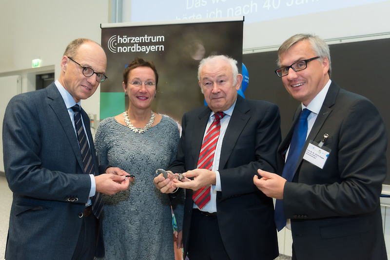 Das Rauschen der Blätter im Herbst, das Knirschen des Schnees im Winter und das Summen der Bienen im Frühling: Wer schlecht hört, nimmt zum einen diese feinen Geräusche nicht mehr wahr und büßt Lebensqualität ein. Zum anderen fällt Betroffenen die Orientierung im Alltag immer schwerer und sie werden zunehmend gesellschaftlich isoliert. "Das muss nicht sein", finden die Experten des Universitätsklinikums Erlangen und bündeln nun unter dem Dach des Hörzentrums Nordbayern ihre Kompetenzen, um Patienten in jedem Alter das bestmögliche Hören zu ermöglichen. Am vergangenen Wochenende (11.11.2017) eröffneten Prof. Dr. Dr. h. c. Heinrich Iro, Direktor der Hals-Nasen-Ohren-Klinik - Kopf- und Halschirurgie, Prof. Dr. Dr. Ulrich Hoppe, Leiter des Cochlear-Implant-Centrum CICERO der HNO-Klinik, der bayerische Ministerpräsident a. D. Dr. Günther Beckstein und Erlangens Bürgermeisterin Dr. Elisabeth Preuß im Rahmen des 8. Erlanger Hörtags gemeinsam das neue Zentrum. Die Veranstaltung war mit über 200 Teilnehmern aus der ganzen Region - sowohl Betroffenen als auch Interessierten - wieder gut besucht.