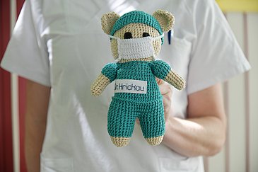 Hannah Lerzer häkelt für ihr Leben gern. In der Kinderchirurgischen Abteilung (kommissarischer Leiter: Prof. Dr. Robert Grützmann) und in den Bereichen Pädiatrische Gastroenterologie und Pädiatrische Rheumatologie der Kinder- und Jugendklinik (Direktor: Prof. Dr. Joachim Wölfle) des Universitätsklinikums Erlangen ist die heute 18-Jährige seit 2017 ein bekanntes Gesicht, denn: Seitdem ist Hannah dort Patientin. Als Dankeschön für die gute Betreuung und Behandlung am Uni-Klinikum Erlangen hatte sie bereits 2020 einen Spendenscheck an die Fachbereiche übergeben. Das Geld stammte aus dem Verkauf von selbst gemachten Kuscheltieren. Seitdem häkelte Hannah weiter und legte nun, zum Abschluss ihrer Therapie in der Kinderklinik, noch einen Scheck über 2.600 Euro nach.