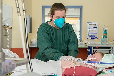 Perfusionist Nicola Kwapil von der Sektion Kinderherzchirurgie in der Herzchirurgischen Klinik (Direktor: Prof. Dr. Oliver Dewald) des Uniklinikums Erlangen suchte den geeigneten Oxygenator für Hannah aus. Er nahm ein kindgerechtes, mobiles Transportset mit nach Chemnitz, schloss das Mädchen dann gemeinsam mit den Ärzten an die ECMO an und stellte Parameter wie Blut- und Gasfluss sowie Sauerstoffzufuhr für Hannah passend ein. „Weil Kinder ein höheres Thromboserisiko haben, behalten die Ärztinnen und Ärzte und ich immer auch die Blutgerinnung im Blick und nutzen blutverdünnende Medikamente“, erklärt der Perfusionist. Wie viel Blut pro Minute durch die ECMO-Pumpe fließt, kann fein justiert werden; dabei achten die Ärztinnen und Ärzte stets auf die Kreislaufwerte ihrer kleinen Patientinnen und Patienten und regulieren gemeinsam mit dem Perfusionisten, wie viel Sauerstoff ins Blut übergeht und wie viel Kohlendioxid ihm entzogen wird. Zusätzlich werden die betroffenen Patientinnen und Patienten behutsam mechanisch beatmet, um ihre Lungen zu schonen und heilen zu lassen. Die veno-venöse ECMO ermöglichen die Erlanger Spezialistinnen und Spezialisten Kindern jeden Alters – sogar Neugeborenen. Speziell ausgebildete pädiatrische Pflegefachkräfte betreuen die ECMO-Patientinnen und -Patienten schließlich mit viel Herzblut und Fachwissen.