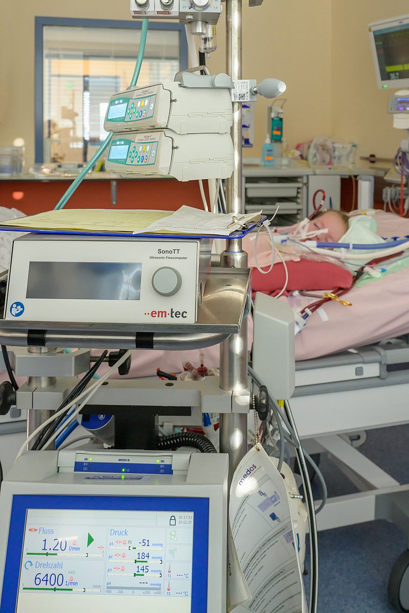 Die veno-venöse ECMO, die Hannah angelegt wurde, unterstützt die Lunge außerhalb des Körpers – etwa bei einem schweren Lungenversagen, einer Lungenentzündung oder einer Sepsis. Dazu wird sauerstoffarmes Blut aus dem Körper geleitet und im ECMO-System oxygeniert, also mit Sauerstoff versetzt. Prof. Reutter beschreibt die Herausforderung: „Bei Kindern sind alle anatomischen Strukturen, zum Beispiel die Venen, viel kleiner. Deshalb muss man ultraschallgesteuert genau schauen, dass die Kanüle der ECMO wirklich richtig liegt. Also dass sie über den rechten Vorhof des Herzens in die untere Hohlvene geht, dass dort sauerstoffarmes Blut angesaugt wird und es dann, mit Sauerstoff angereichert, zum rechten Vorhof zurückgeführt wird.“