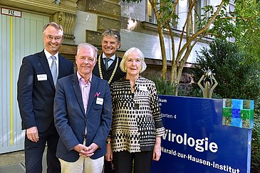 Das Virologische Institut – Klinische und Molekulare Virologie (Direktor: Prof. Dr. Klaus Überla) des Uniklinikums Erlangen trägt ab sofort einen neuen Namen und ehrt damit seinen Gründer Harald zur Hausen – Pionier auf dem Gebiet der Krebsforschung. Der neue Name „Virologisches Institut – Harald-zur-Hausen-Institut für Virologie“ ist auch auf dem neu gestalteten Eingangsschild zu lesen, das jetzt zusammen mit einem Bild des Namensgebers bei einem Symposium im Beisein der Ehefrau Prof. Dr. Ethel-Michele de Villiers und seines Sohnes Dr. Jan zur Hausen feierlich enthüllt wurde.