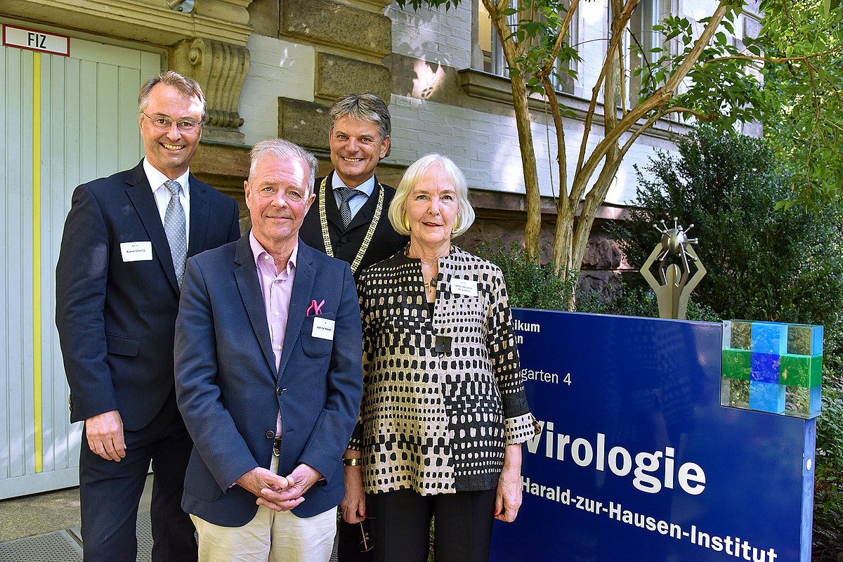 Das Virologische Institut – Klinische und Molekulare Virologie (Direktor: Prof. Dr. Klaus Überla) des Uniklinikums Erlangen trägt ab sofort einen neuen Namen und ehrt damit seinen Gründer Harald zur Hausen – Pionier auf dem Gebiet der Krebsforschung. Der neue Name „Virologisches Institut – Harald-zur-Hausen-Institut für Virologie“ ist auch auf dem neu gestalteten Eingangsschild zu lesen, das jetzt zusammen mit einem Bild des Namensgebers bei einem Symposium im Beisein der Ehefrau Prof. Dr. Ethel-Michele de Villiers und seines Sohnes Dr. Jan zur Hausen feierlich enthüllt wurde.