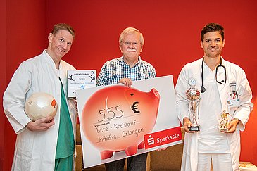 „Kittel aus, Trikot an“ hieß es Mitte April, als wieder der Med-Cup angepfiffen wurde – das traditionelle Fußballturnier, an dem Teams bestehend aus Ärzten und Pflegekräften aus Kliniken sowie Mitarbeitern medizinischer Einrichtungen der gesamten Region teilnehmen. Die Finalspiele entwickelten sich zum dramatischen Erlangen-Derby, aus dem die Mannschaft der Medizinischen Klinik 2 – Kardiologie und Angiologie (Direktor: Prof. Dr. Stephan Achenbach) des Universitätsklinikums Erlangen als Drittplatzierter herausging. Als Vorjahressieger und damit ausrichtende Einrichtung stand es den Kardiologen frei, zu entscheiden, welchem guten Zweck die Erlöse aus Startgeldern und Spenden zukommen. 555 Euro gingen jetzt an die Herz-Kreislauf-Initiative am Herzzentrum der Universität Erlangen-Nürnberg e. V. (HKI).