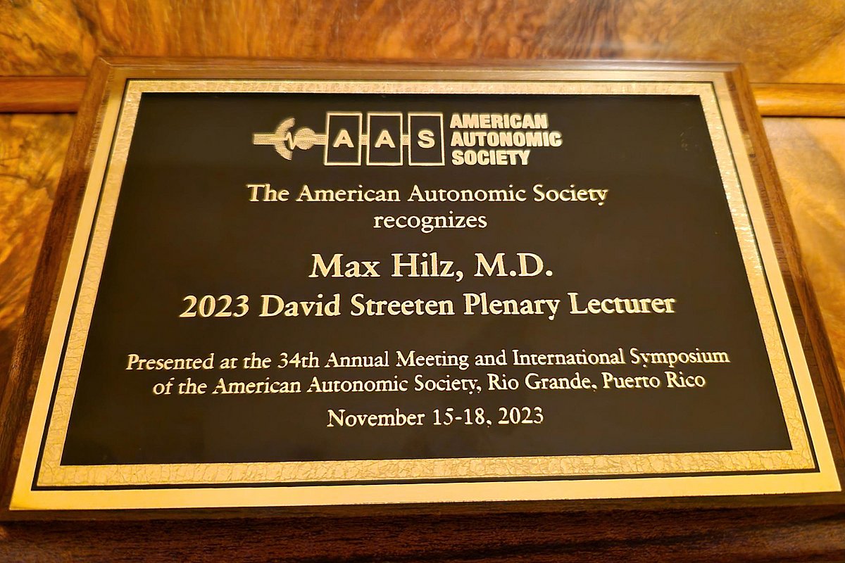Ausgewählt zu werden, gilt als große persönliche Ehre und herausragende Würdigung der eigenen Forschungsarbeit: Prof. Dr. Dr. h. c. Max J. Hilz, emeritierter Mitarbeiter der Neurologischen Klinik (Direktor: Prof. Dr. Dr. h. c. Stefan Schwab) des Uniklinikums Erlangen, durfte die renommierte David Streeten Plenary Lecture 2023 halten. Diese Vorlesung ist fester Bestandteil der Jahrestagung der American Autonomic Society, der weltweit bedeutendsten Fachgesellschaft im Bereich der klinischen Forschung und Arbeit auf dem Gebiet des autonomen Nervensystems. Prof. Hilz stellte in seinem Vortrag „Central Autonomic Dysregulation due to stress and brain lesions, and the effects of relaxation“ einige Aspekte der Arbeiten dar, die er gemeinsam mit seinem Team im Autonomen Labor der Neurologie des Uniklinikums Erlangen sowie in seinem früheren Autonomen Labor an der New York University durchgeführt hatte.