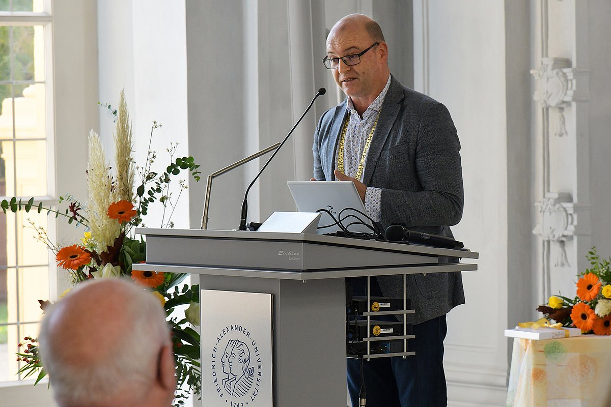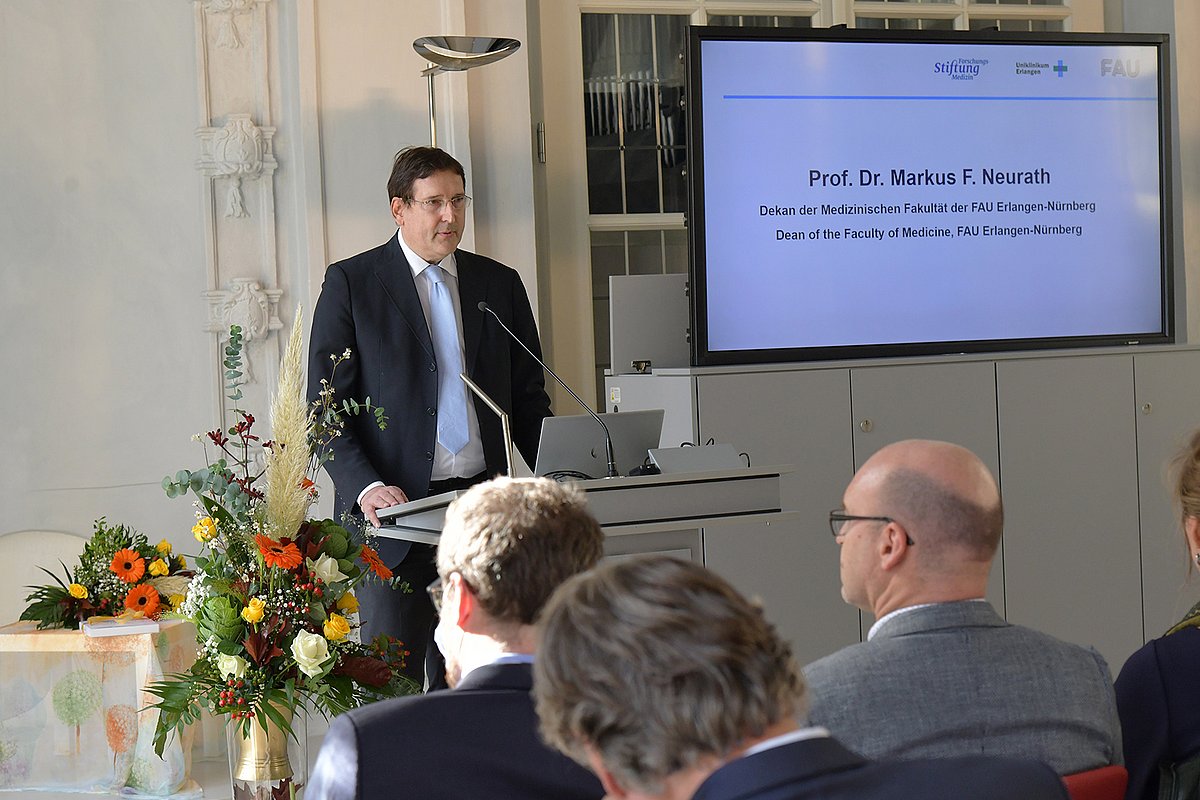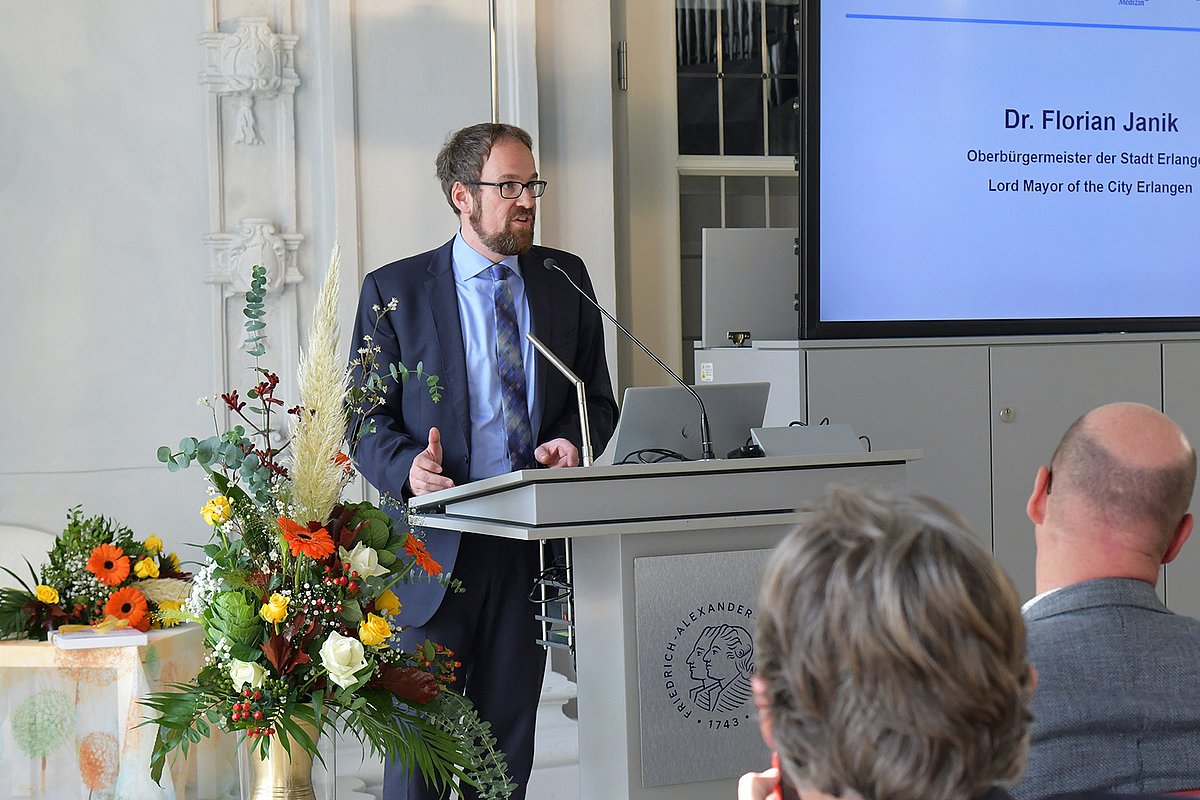 Nach einer musikalischen Einleitung begrüßte Prof. Dr. Markus F. Neurath, Dekan der Medizinischen Fakultät an der Friedrich-Alexander-Universität Erlangen-Nürnberg (FAU), die anwesenden Gäste. Er gratulierte Prof. Easton für seinen wissenschaftlichen Erfolg und die Würdigung seiner Leistungen mit dem Jakob-Herz-Preis. Prof. Dr. Georg Schett, Vizepräsident Forschung der FAU, stellte den Werdegang und das Schaffen von Jakob Herz dar und betonte die translationale Forschung an der hiesigen Universität. Der Oberbürgermeister der Stadt Erlangen Dr. Florian Janik veranschaulichte, wie wichtig die Etablierung des Jakob-Herz-Preises ist: Mit der Auszeichnung ist die Erinnerung an Jakob Herz, an den Antisemitismus sowie an die unrühmliche Vergangenheit der Stadt und der Universität während des Naziregimes verbunden. Den Jakob-Herz-Preis sieht der Oberbürgermeister als Auszeichnung und politisches Symbol, dass Erlangen aus seiner Geschichte gelernt hat.
