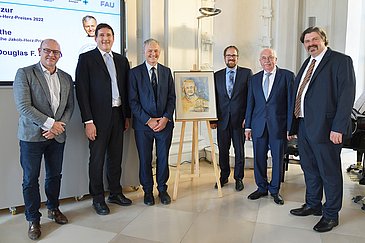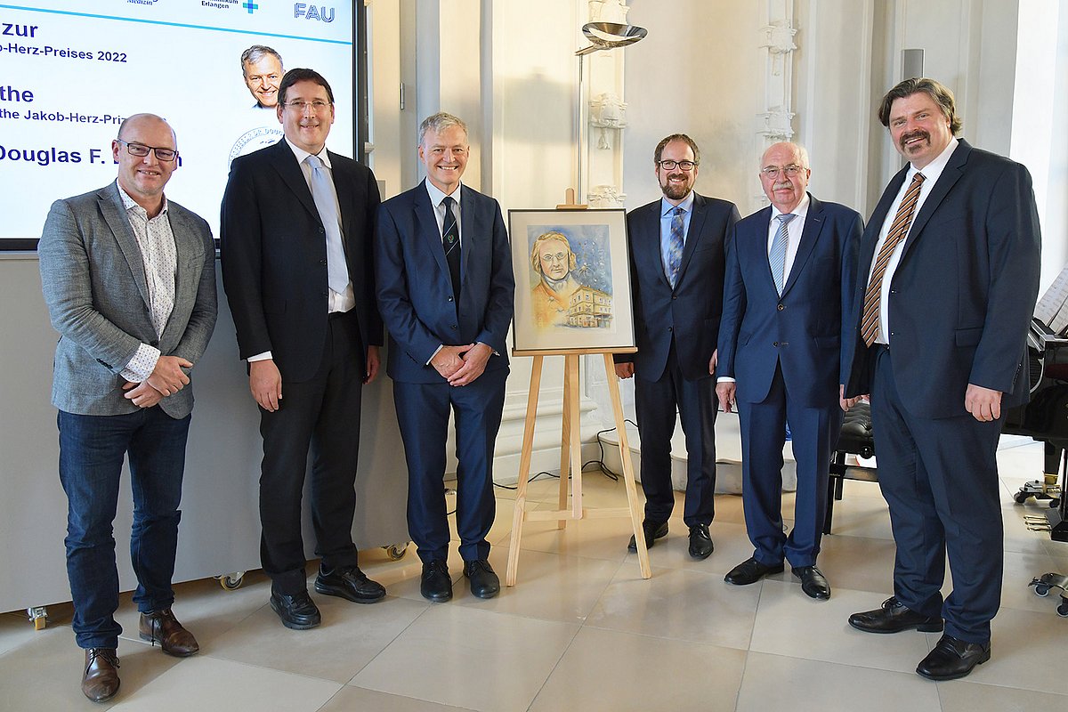 Am Freitag, 7. Oktober 2022, wurde zum siebten Mal der Jakob-Herz-Preis verliehen. Zusammen mit der Forschungsstiftung Medizin am Uniklinikum Erlangen wird die Auszeichnung alle zwei Jahre für herausragende wissenschaftliche Erfolge aus der theoretischen und klinischen Medizin vergeben. Der diesjährige Preisträger Prof. Dr. Douglas F. Easton aus Cambridge (England) erhielt den Jakob-Herz-Preis in Anerkennung für seine wissenschaftlichen Leistungen auf dem Gebiet der Brustkrebsforschung. Außerdem enthüllte Prof. Easton ein Gemälde der Herzogenauracher Künstlerin Ilonka Münsterer-Maar, das anlässlich der Verleihung als Unikat für den Preisträger angefertigt wurde. Das Bild zeigt neben der damaligen Klinik den Namensgeber Jakob Herz und Krebszellen.