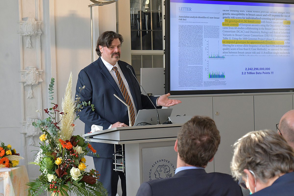 Prof. Dr. Peter Fasching, Oberarzt der Frauenklinik des Uniklinikums Erlangen, berichtete über die langjährige Zusammenarbeit mit dem Preisträger und betonte Prof. Eastons hochrangige Forschung in der Ermittlung der Risikofaktoren zur Entstehung des Brustkrebses. In einem Vortrag berichtete Prof. Easton über seine Forschungsergebnisse und klärte über die Risikofaktoren für ein Mammakarzinom auf. Der Preisträger freute sich sehr über die Ehrung und bedankte sich für die Auszeichnung und für die langjährige und erfolgreiche Zusammenarbeit mit der Medizinischen Fakultät. Dabei hob er die Kooperationen mit Prof. Dr. Matthias W. Beckmann, Direktor der Frauenklinik des Uniklinikums Erlangen, sowie mit Prof. Fasching besonders hervor.