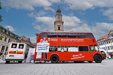 Der Infobus „Herzenssache Lebenszeit“ ist auch heuer wieder auf Tour: In knapp 100 deutschen Städten klären Spezialistinnen und Spezialisten über Risikofaktoren und Vorsorgemaßnahmen bei Diabetes, Schlaganfall und Herz-Kreislauf-Erkrankungen auf. Am Freitag, 28. Juni 2024, steht der rote Doppeldeckerbus von 10 bis 15 Uhr auf dem Erlanger Hugenottenplatz für alle Interessierten bereit. Die Expertinnen und Experten der Anästhesiologischen Klinik (Direktor: Prof. Dr. Roland C. E. Francis), der Medizinischen Klinik 1 – Gastroenterologie, Pneumologie und Endokrinologie (Direktor: Prof. Dr. Markus F. Neurath), der Medizinischen Klinik 2 – Kardiologie und Angiologie (Direktor: Prof. Dr. Stephan Achenbach) und der Neurologischen Klinik (Direktor: Prof. Dr. Dr. h. c. Stefan Schwab) des Uniklinikums Erlangen beantworten im Gespräch gern allgemeine und individuelle Fragen. Wer mag, kann auch einen Blick in einen Rettungs- und einen Notarztwagen werfen und sich von den Mitarbeitenden der Anästhesiologie die Ausstattung und die Abläufe bei einem Einsatz erklären lassen.