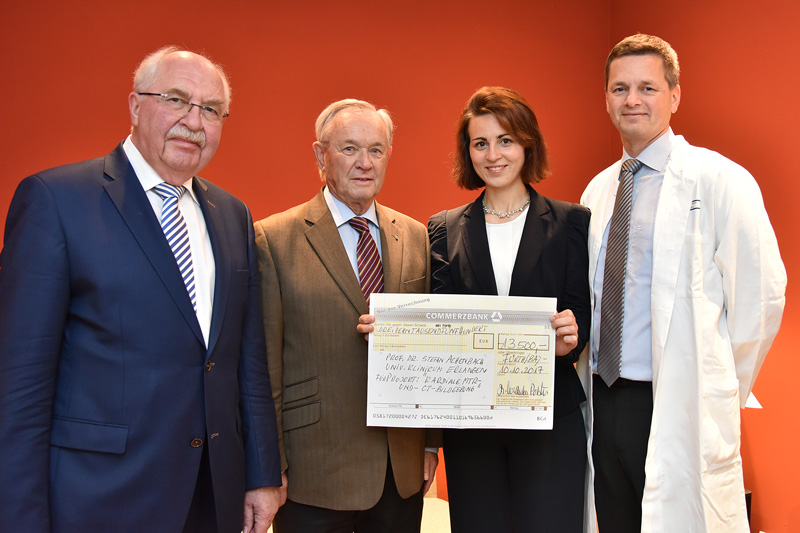 Bislang wird ist die Diagnostik von Herzklappeninsuffizienzen häufig dadurch erschwert, dass der genaue Schweregrad der Undichtigkeit mittels Echokardiographie (Ultraschall) nur ungenau quantifizierbar ist. Ein deutsch-britisches Forschungsprojekt hat jetzt das Ziel, die Magnetresonanztomografie (MRT) als weitaus präziseres Messverfahren bei der Mitralklappeninsuffizienz weiter zu etablieren. Dr. Michaela Hell, Assistenzärztin der Medizinischen Klinik 2 – Kardiologie und Angiologie (Direktor: Prof. Dr. Stephan Achenbach) des Universitätsklinikums Erlangen, arbeitete zu diesem Zweck drei Monate lang mit sechs Kollegen der Universität Oxford in Großbritannien zusammen. Ihr Forschungsaufenthalt vor Ort wurde von der Manfred-Roth-Stiftung und der Forschungsstiftung Medizin am Uni-Klinikum Erlangen mit insgesamt 20.000 Euro finanziert. Jetzt (10.10.2017) übergaben die beiden Vorstandsvorsitzenden Prof. Dr. Werner G. Daniel und Dr. Wilhelm Polster den Spendenscheck.