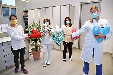 Gutes tun und an andere denken – diesem Grundsatz sind die Klassen 6a und 6b der Katzwanger Grund- und Mittelschule gefolgt: Sie spendeten 100 Kissen in Herzform an Brustkrebspatientinnen, die sie selbst genäht haben. Stellvertretend für die vielen fleißigen Hände überreichte ihre Lehrerin Melanie Müller die Herzkissen an Oberärztin PD Dr. Carolin Hack und Sabine Holzmann, Gesundheits- und Krankenpflegerin in der Frauenklinik (Direktor: Prof. Dr. Matthias W. Beckmann) des Universitätsklinikums Erlangen. Das erste Herzkissen aus der Spende nahm die Patientin Gordana Spicko dankend entgegen.