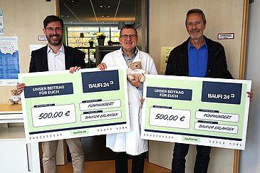 Zweimal 500 Euro und eine Kiste voller Teddybären – im Rahmen des Social Sponsoring Programms der Baufi24 Baufinanzierung AG entschieden sich Christoph Altemeier, Leiter der Baufi24-Geschäftsstelle Erlangen, und sein Kollege, Finanzierungsberater Ralf Haßler, für eine Spende an die Kinderkardiologische Abteilung (Leiter: Prof. Dr. Sven Dittrich) des Uniklinikums Erlangen sowie die Aktion „Kinderherz-OP“ der Kinderkardiologie und der Herzchirurgischen Klinik (Direktor: Prof. Dr. Oliver Dewald) des Uniklinikums Erlangen. Prof. Dittrich nahm die Schecks und die Stofftiere nun dankend entgegen.