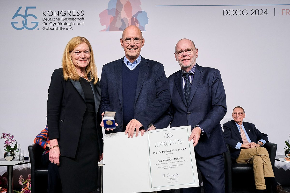 Im Rahmen der Eröffnungsveranstaltung des 65. Kongresses der Deutschen Gesellschaft für Gynäkologie und Geburtshilfe e. V. (DGGG) in Berlin erhielt Prof. Dr. Matthias W. Beckmann, Direktor der Frauenklinik des Uniklinikums Erlangen und langjähriger DGGG-Leitlinienbeauftragter, die bedeutende Carl-Kaufmann-Medaille. Es ist die höchste Auszeichnung, die einer Gynäkologin bzw. einem Gynäkologen in Deutschland, Österreich und der Schweiz zugesprochen werden kann.