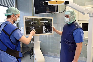Zum Navigationsgerät gehören spezielle chirurgische Instrumente, an deren Spitze sich sogenannte Markerkugeln befinden. Die in den Markerkugeln integrierten Reflektoren kommunizieren über Infrarot mit dem Gerät. Klinikdirektor Mario Perl: „Der 3-D-Scanner ermöglicht uns aktuelle Aufnahmen während des Eingriffs. So erhalten wir Bilder des Operationsbereichs und können damit navigieren. Das Navigationsgerät blendet zusätzlich die eingesetzten Instrumente ein, sodass der Chirurg zum Beispiel genau sehen kann, wo er gerade mit dem Bohrer ansetzt.“ Gerade, wenn bei komplexen Eingriffen im Hals- und Brustwirbelbereich oder am hinteren Beckenring Implantate gesetzt werden müssen, sei die Präzision des neuen Systems Gold wert, erläutert Dr. Holger Keil, Oberarzt der Unfallchirurgie des Uni-Klinikums Erlangen: „Es ist ein hervorragendes Hilfsmittel und eine massive Arbeitserleichterung. Vor allem, wenn zum Beispiel eine durch Morbus Bechterew ausgelöste massive Verknöcherung an der Wirbelsäule vorliegt und diese die konventionelle Bildgebung erschwert.“