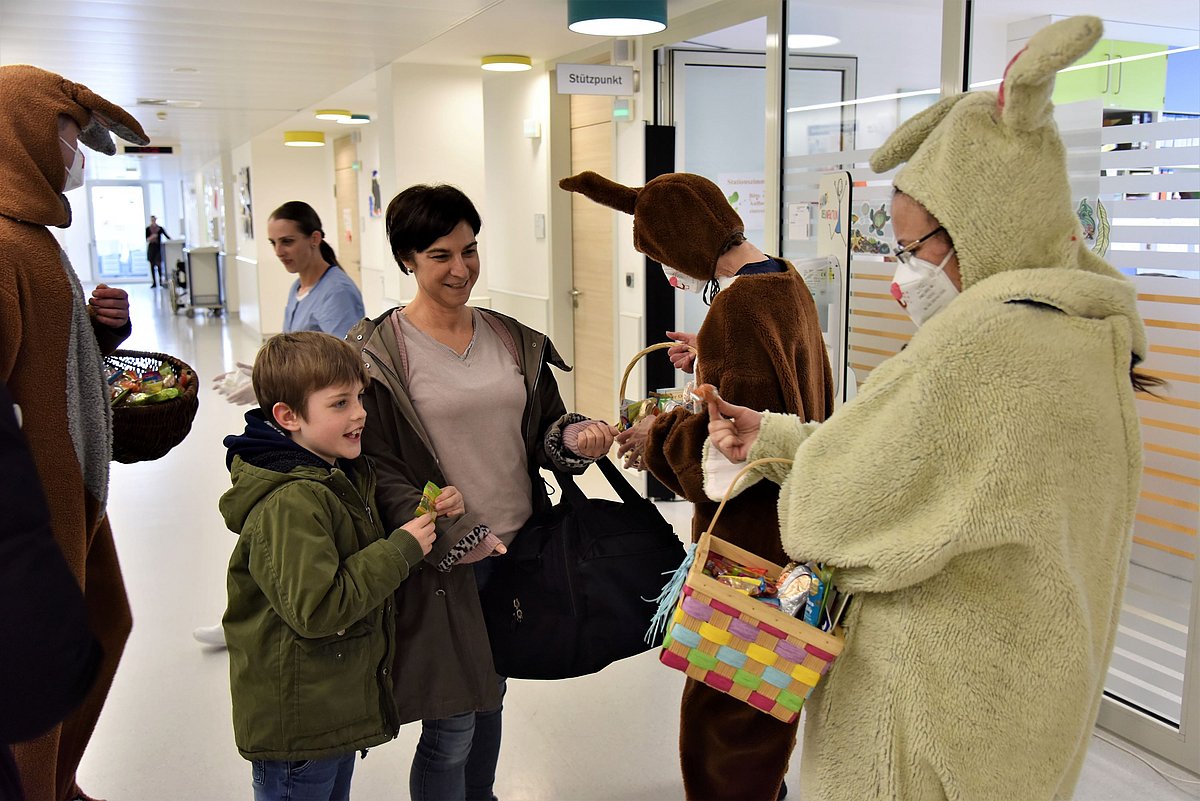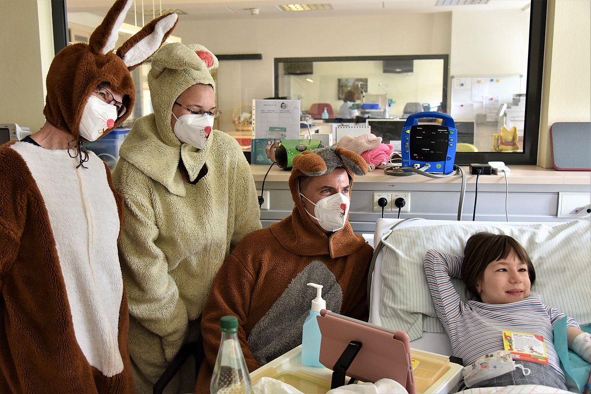 Eigentlich bekommt man ihn nur schwer zu Gesicht – und erst recht nicht vor eine Kameralinse. Wer allerdings in diesen Tagen auf den Stationen der Kinder- und Jugendklinik (Direktor: Prof. Dr. Joachim Wölfle) des Uniklinikums Erlangen die Augen offenhielt, der konnte einen Blick auf ihn erhaschen – da hoppelte doch tatsächlich der Osterhase von Zimmer zu Zimmer! Und nicht nur einer: Insgesamt fünf flauschige Langohren mit prall gefüllten Körben machten Visite und verteilten süße Überraschungen an die kranken Kinder und Jugendlichen.