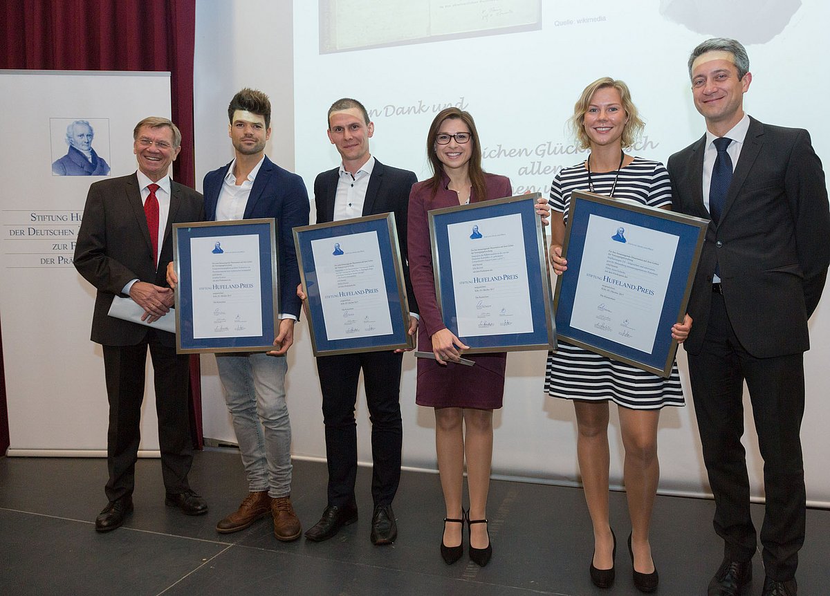 Der im Jahr 1959 erstmals ausgeschriebene Hufeland-Preis ist der renommierteste Preis auf dem Gebiet der Präventivmedizin und der Versorgungsforschung. Jetzt unterstützt die Stiftung Hufeland-Preis der Deutschen Ärzteversicherung AG erstmals zusätzlich vier exzellente wissenschaftliche Dissertationen aus dem Jahr 2016 auf dem Gebiet der Präventivmedizin und der Versorgungsforschung.