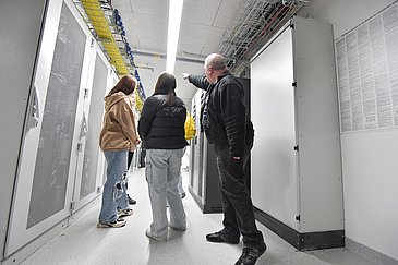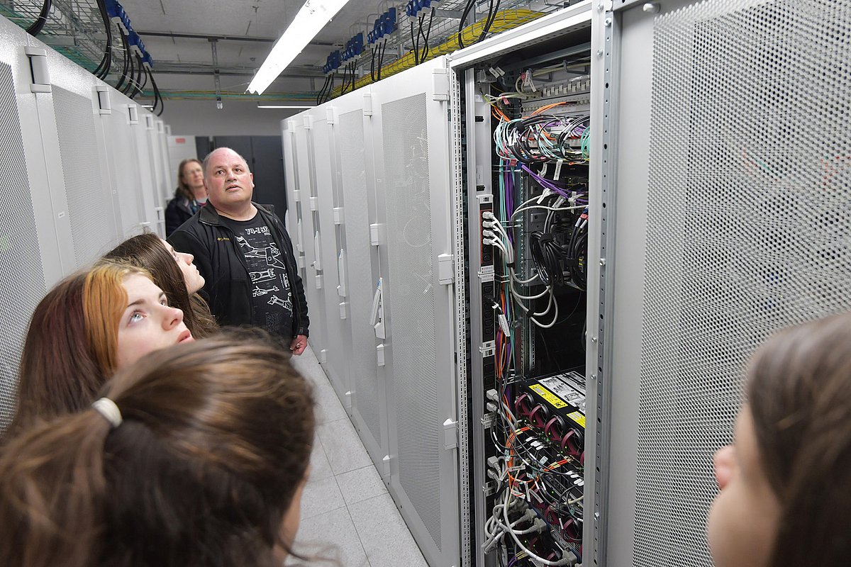 In der Zwischenzeit bei den Mädchen: Sie erkundeten die Serverräume des Uniklinikums Erlangen, das Herz der zentralen Informationstechnik, erfuhren, wie das Uniklinikum IT-technisch aufgestellt ist und was sie für den Ausbildungsberuf der Fachinformatikerin – Systemintegration mitbringen müssen. Durch die Räume geführt wurden sie von Jens Beute, Leiter der Abteilung Systemtechnik, sowie Matthias Löhr (ebenfalls Systemtechnik) und Anna Hertel von der Abteilung IT für Forschung und Management. Alle drei gehören zum Medizinischen Zentrum für Informations- und Kommunikationstechnik (MIK) des Uniklinikums Erlangen. Anna Hertel betonte: „Wir würden uns sehr über weiblichen Nachwuchs freuen!“ Die Mädchen lernten u. a., was die IT an einem großen Krankenhaus leisten muss, welche Sicherheitsvorkehrungen es gibt, warum immer ein kühler Wind durch den Serverraum weht und was z. B. passieren würde, wenn plötzlich der Strom wegbliebe. Auch anhand eines Computerspiels demonstrierte das MIK, dass IT Spaß macht und längst keine reine Männerdomäne mehr ist. Schülerin Sarah war von der Führung begeistert: „Ich hätte es mir hier nicht so informativ vorgestellt. Ich interessiere mich sehr für Technik und IT ist schon lange mein Traumberuf. Ich habe schon viele Dokus geschaut und kenne mich deshalb auch schon ein bisschen mit Servern aus“, sagte sie.
