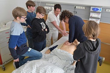 Nach der Brozeitpause gab es beim Boys’Day den praktischen Teil im Skills Lab im Bettenhaus: Freiwillige Schüler konnten sich hier den Arm eingipsen lassen und erfuhren, dass das gar nicht so einfach ist, wie es klingt. Die Gelenke müssen in der richtigen Position sein, es darf keine Druckstellen auf der Haut geben, es ist zu bedenken, dass ein gebrochener Arm anschwillt, und vieles mehr. Parallel dazu durfte eine Gruppe im Nebenraum das Patientenbett bedienen, es hoch und runter fahren, schräg nach hinten kippen oder das Kopfteil aufrichten. „Im Liegen kann dem Patienten das Atmen schwerfallen. Wenn seine Beine hochgelagert sind, steigt der Blutdruck“, erklärte Jörg Gebauer. Zudem durften die Jungs spezielle Brillen aufsetzen, die verschiedene Augenerkrankungen simulieren – etwa eine Makuladegeneration oder eine Netzhautablösung. Ziel war es hier im wahrsten Sinne des Wortes, die Patientensicht einzunehmen: Wie sieht ein älterer Mensch bzw. jemand mit einer Augenerkrankung? Warum braucht sie oder er für manche Dinge etwas länger? Wie kann ich die Person unterstützen? Schließlich kam noch das Reanimieren an einer Simulationspuppe an die Reihe: Dabei lernten die Jungs, wie sie sich bei einem Notfall richtig verhalten, wie sie Puls und Atmung kontrollieren, den richtigen Punkt auf dem Brustkorb finden und eine Herzdruckmassage durchführen. Vor allem die Schulsanitäter konnten viel Vorwissen einbringen und fragten interessiert nach.