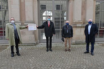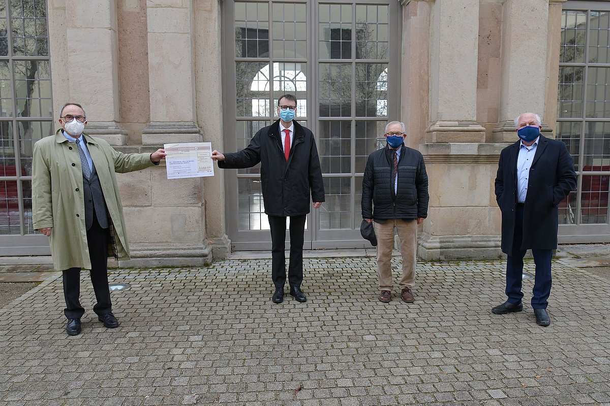 Bildunterschrift: Bei der Scheckübergabe (v. l. n. r.): Klaus Teichmann, Stiftungsratsmitglied der Manfred-Roth-Stiftung, Prof. Dr. Christian Bogdan, Direktor des Mikrobiologischen Instituts – Klinische Mikrobiologie, Immunologie und Hygiene des Uni-Klinikums Erlangen, Dr. Wilhelm Polster, Vorstandsvorsitzender der Manfred-Roth-Stiftung, und Prof. Dr. Werner G. Daniel, Vorstandsvorsitzender der Forschungsstiftung Medizin. Foto: Franziska Männel/Uni-Klinikum Erlangen