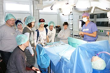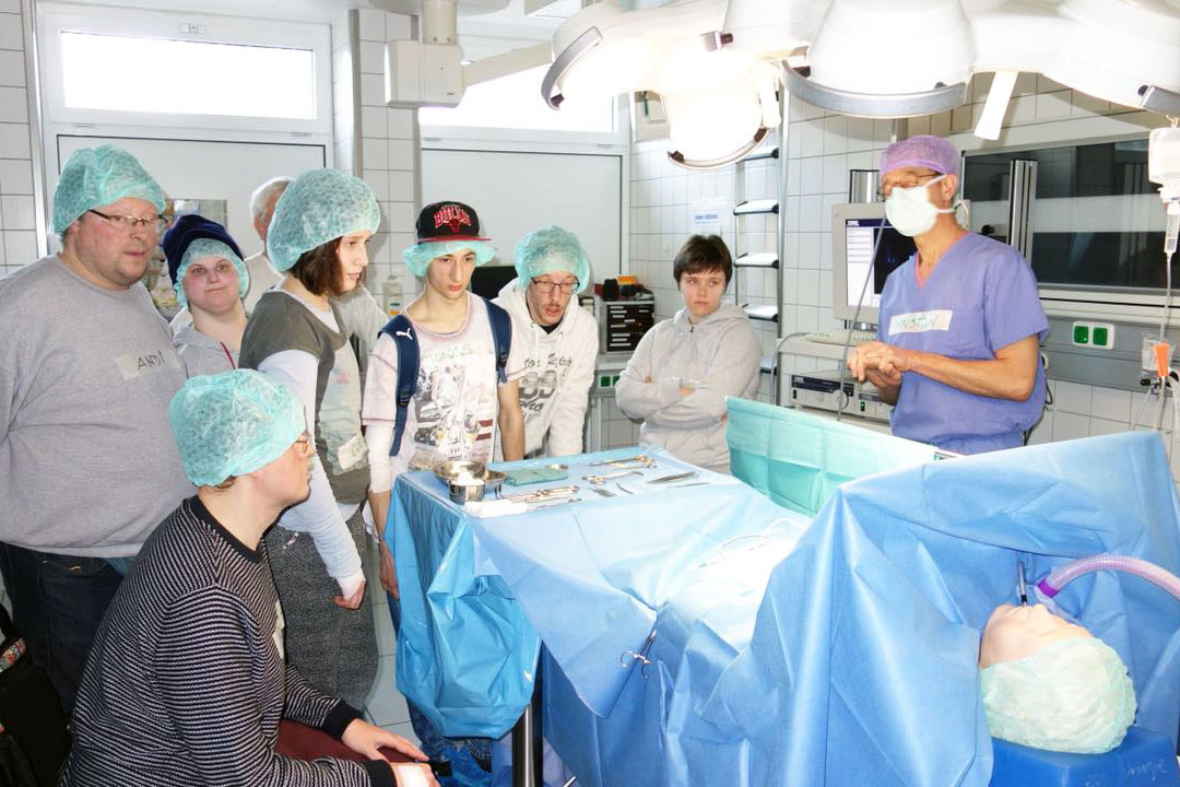 Zu Beginn konnte sich die zehnköpfige Besuchergruppe den Schockraum der Notaufnahme und den Computertomografen ansehen. Anschließend erklärte Gesundheits- und Krankenpflegerin Carina Hummert, wie kleine Wunden am besten versorgt werden. Die Gäste übten dann selbst, Wundpflaster aufzukleben und Wundverbände anzulegen. Ein großes Highlight war der Besuch der OP-Säle: In OP-Kleidung gehüllt und mit Mundschutz und Haube ausgestattet durfte sich die Behindertengruppe verschiedene Instrumente und den OP-Tisch hautnah ansehen. Dabei ging es auch ganz praktisch zu: Mit einem Übungsendoskop konnte jeder Besucher verschiedene Gegenstände in einem verschlossenen Behälter suchen. Großen Spaß machte es den Gästen, Wollfäden, Haargummis, einen Schlüsselbund und einen Geldschein in 40-facher Vergrößerung zu identifizieren. Bestaunt wurde auch die lebensgroße Simulationspuppe, an welcher der Gesundheits- und Krankenpfleger Christian Potrykus eine Narkose mit entsprechender Überwachung und piepsendem Monitor zeigte. Die Besucher waren beeindruckt, als sie ihren eigenen Herzschlag über ein Pulsoxymeter selbst hören konnten. Wer ganz mutig war, konnte mit Schere und Pinzette fachmännisch Tumoren, getarnt als Bonbons, entfernen. Diese wurden vorher in einem Stück Schaumstoff versteckt.