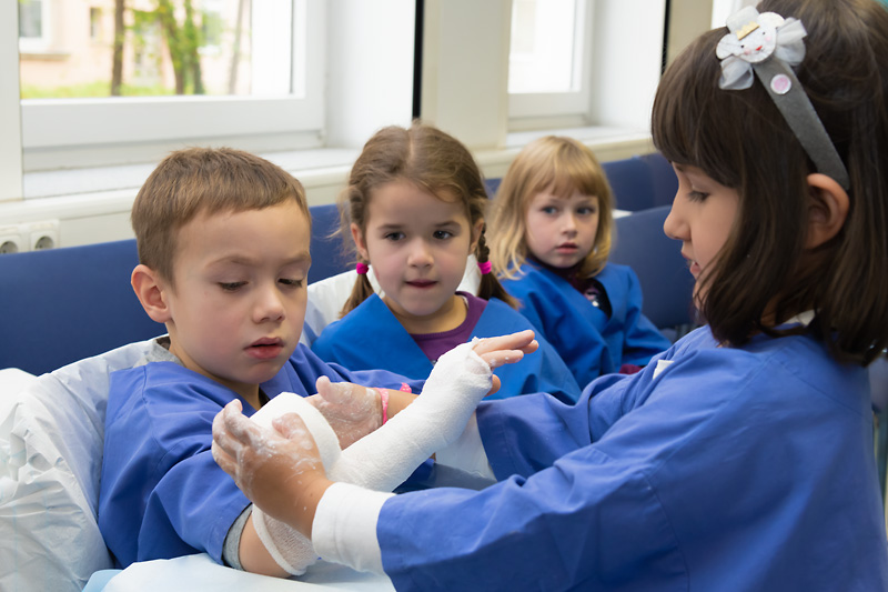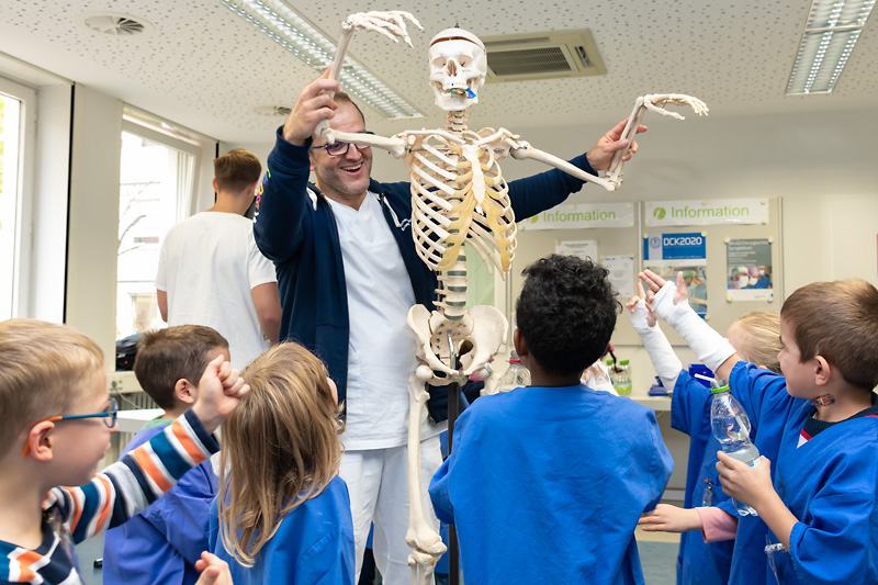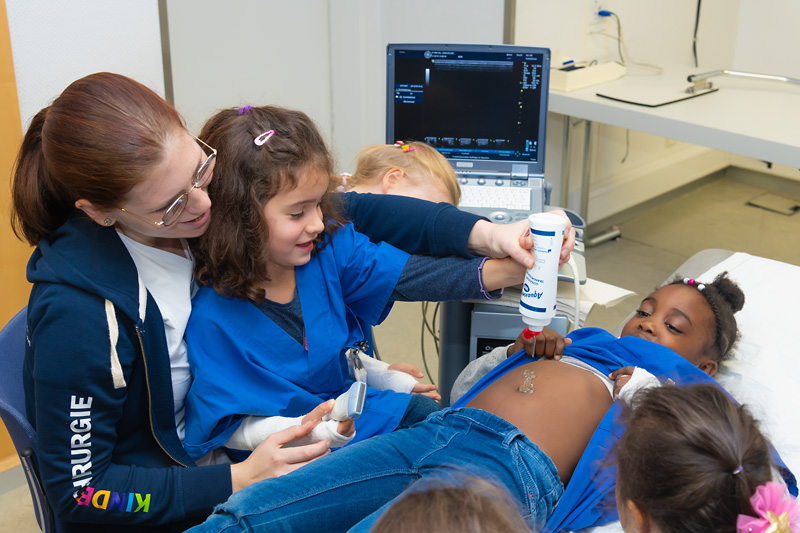 Dr. Manuel Besendörfer, leitender Kinderchirurg, berichtete, die Kinder seien fasziniert und ließen sich alles erklären: „Der heutige Tag ist eine tolle Chance, die Vorschüler an das Thema Krankenhaus heranzuführen. Man könnte meinen, für Kinder seien Ultraschallbilder nicht interessant, da sie ja schwarz-weiß sind. Können die Kleinen aber selbst einmal die Behandlung übernehmen, sind sie fasziniert und vergessen ihre anfängliche Angst.“ So ließ sich beispielsweise Alba von ihrer Freundin Raheela den Bauch untersuchen: „Errate mal, was ich gefrühstückt habe!“ Spätestens bei der Laparoskopie lachten alle Kinder, als sie Gummibärchen aus dem Bauch des fiktiven Patienten fischen durften, und hielten ihre Beute triumphierend in die Höhe.