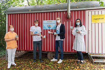 Die Idee für das Kartenspiel hatten die beiden jungen Männer bereits 2015. Gleich zu Beginn ihres Studiums im Herbst 2020 an der FAU Erlangen-Nürnberg nutzten sie die Gelegenheit und beteiligten sich an einem Wettbewerb zum Thema Existenzgründung. Heute sind sie Geschäftsführer ihres eigenen Spieleverlags Simwin Games, das erste Spiel „Kojotix“ ist im Handel und am zweiten, dritten und vierten Spiel arbeiten sie bereits. „Wir legen sehr großen Wert auf Qualität: sowohl was den Unterhaltungswert unserer Spiele angeht als auch deren Produktion“, erläutert Elias Winkler. „Karton, Spielkarten, Anleitung – Kojotix ist komplett ‚made in Germany‘ und klimaneutral gedruckt.“ Marion Müller, leitende Erzieherin der Kinderklinik mit jahrelanger Spielerfahrung, lobte insbesondere die Stabilität der Spielkarten und freute sich schon bei der Übergabe darauf, das Spiel mit ihren Patientinnen und Patienten auszuprobieren. „Wir werden ausgiebig testen“, versprach sie und fügte schmunzelnd hinzu: „Auch für zukünftige Produkttests stehen wir gerne zur Verfügung.“
