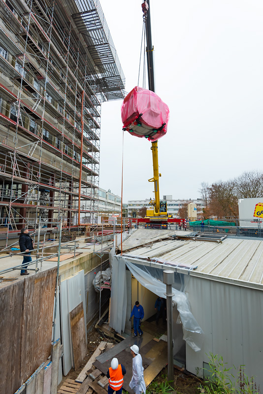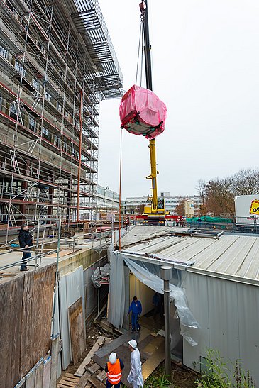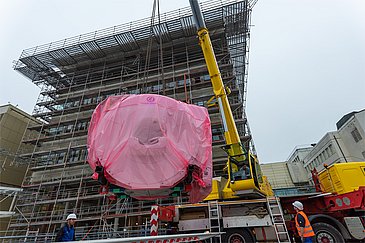 Am heutigen Dienstag (27.11.2018) wurde ein vier Tonnen schwerer Magnet für einen hochmodernen neuen Magnetresonanztomografen (MRT) mit einem Autokran ins Untergeschoss des Internistischen Zentrums des Universitätsklinikums Erlangen gehoben. Das neue MRT-Gerät soll im Rahmen einer Kooperation mit dem Imaging Science Institute Erlangen (ISI) genutzt werden.