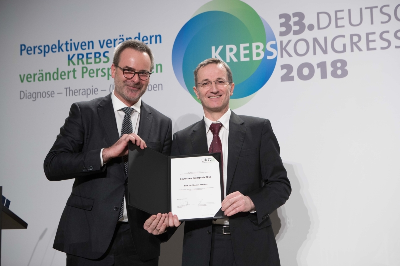 In der Sparte "Klinische Forschung" ging der Preis in diesem Jahr an Prof. Dr. Hartmut Goldschmidt (Universitätsklinikum Heidelberg und Nationales Centrum für Tumorerkrankungen, Heidelberg), den Preis in der Sparte "Translationale Forschung" erhielt Prof. Dr. Michael Baumann vom Deutsches Krebsforschungszentrum in Heidelberg.