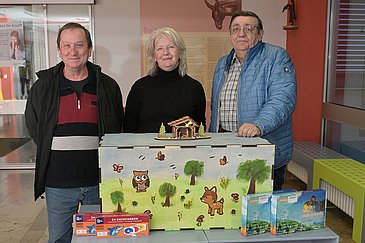 Zur traditionellen Weihnachtsdekoration gehört neben einem Adventskranz und einem schön geschmückten Christbaum auch eine Weihnachtskrippe mit Maria und Josef, dem Stern von Bethlehem sowie Ochs und Esel, die allesamt rund um das Christkind versammelt sind. Damit sich auch die jungen Patientinnen und Patienten der Kinder- und Jugendklinik (Direktor: Prof. Dr. Joachim Wölfle) des Uniklinikums Erlangen in der Vorweihnachtszeit auf das Fest freuen können, überreichten nun Manfred Kreiner und Hans Schmitt vom Krippenfreunde Herzogenaurach e. V. Bastelsets für insgesamt 15 kleine und 3 große Holzkrippen an die leitende Erzieherin der Kinderklinik Marion Müller.