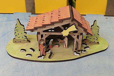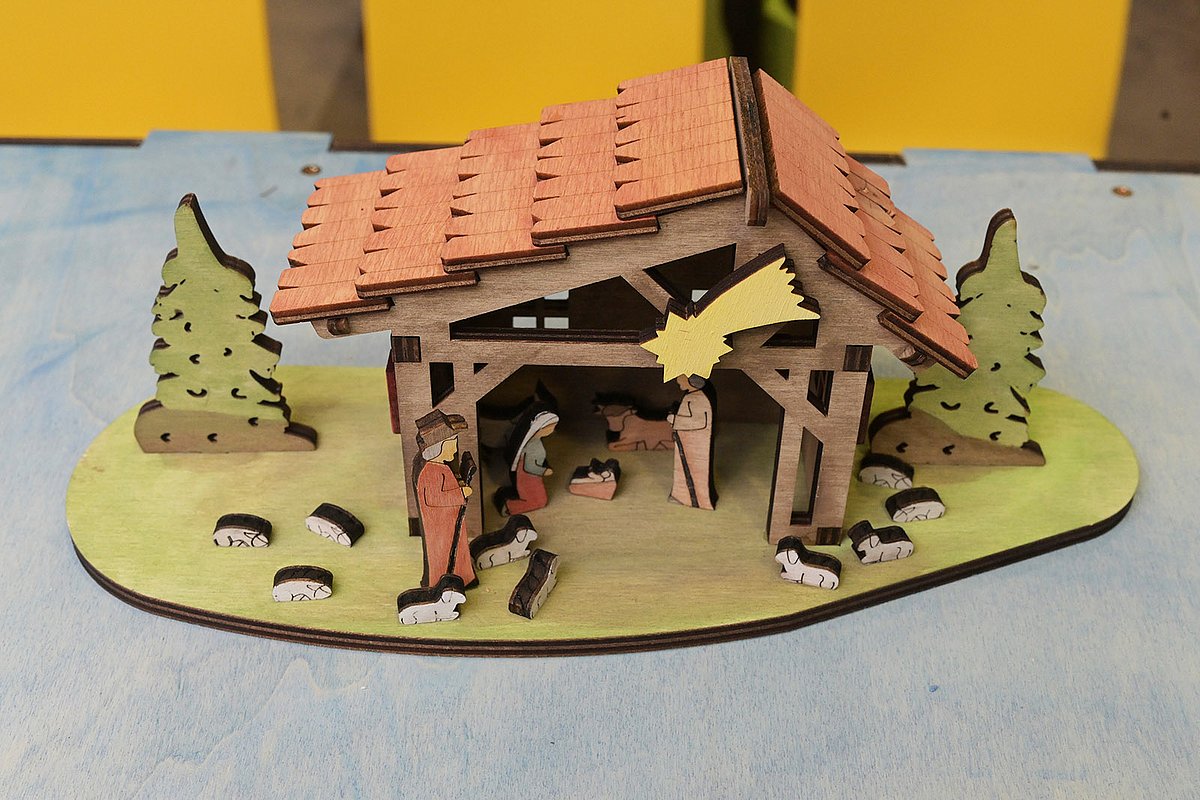 Zunächst hatte Manfred Kreiner das Design der Krippe entworfen und im FabLab Landkreis Fürth e. V. den Laser programmiert. Das FabLab stellt Heimwerkerinnen und Bastlern in der Regel kostenfrei Maschinen und Werkzeuge zur Verfügung, mit denen sie die gewünschten Arbeiten erledigen können. In liebevoller Handarbeit laserte Manfred Kreiner dort schließlich jedes Einzelteil aus Holzspanplatten. „Etwa 20 Minuten dauert es, bis alles für eine kleine Krippe fertig ist“, berichtete Manfred Kreiner. Die Holzplatten sowie Acryl- und Wasserfarben, mit denen die jungen Patientinnen und Patienten ihre Krippe bemalen können, stellten die Krippenfreunde Herzogenaurach zur Verfügung. „Es freut uns, dass wir den Kindern mit den Krippen ein wenig Spaß bereiten können“, sagte der Vereinsvorsitzende Hans Schmitt. Marion Müller bedankte sich herzlich für die weihnachtlichen Bastelsets: „Die Kinder werden sich riesig freuen, wenn sie die Krippen zusammenbauen und dann nach Lust und Laune bemalen dürfen. Selbstverständlich dürfen sie die dann auch mit nach Hause nehmen.“