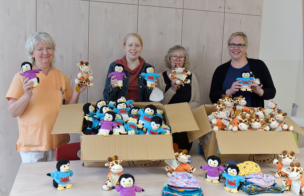 Die Plüschpinguine und -giraffen gehen vorrangig an schwer und/oder chronisch kranke Kinder und Jugendliche, etwa solche mit Mukoviszidose, Krebs, einem Herzfehler, einer Nierenerkrankung, Diabetes oder Rheuma. „Uns ist wichtig, dass die Kuscheltiere immer auf allen Stationen einer Klinik verteilt werden, da sich unsere Aktion an alle Bereiche richtet“, erklärt Sarah. Und so setzten es Marion Müller, leitende Erzieherin der Erlanger Kinderklinik, und ihre Kollegin Pamela Krebs nun auch um. „Ich finde es toll, dass ihr aufgrund eurer eigenen Geschichte solche Aktionen macht. Ihr wisst einfach, was es in so einer Situation braucht und dass etwas zum Kuscheln nie verkehrt ist“, sagte Marion Müller, und Pamela Krebs ergänzte: „Das Schöne ist: Die Plüschtiere bleiben den Kindern und Jugendlichen erhalten und erinnern sie auch noch viele Jahre nach der Krankenhauszeit daran, was sie schon alles geschafft haben.“