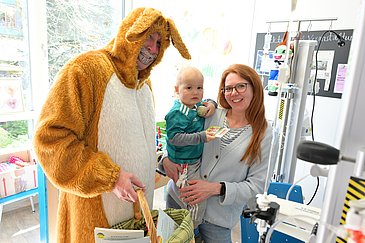 Süße Nougateier, goldglänzende Schokohasen, Bilderbücher und mehr brachten die fünf Hasen für die Kinder und Jugendlichen auf den Stationen der Kinderklinik mit. Die Freude bei den anwesenden Eltern, Patientinnen und Patienten war groß. Es wurden Erinnerungsfotos geschossen und eine Mutter kommentierte ganz überrascht: „Ach, wie schön, dass wir das heute mitkriegen!“, während ihr Sohn auf ihrem Schoß bereits ein großes Schoko-Osterei auswickelte.